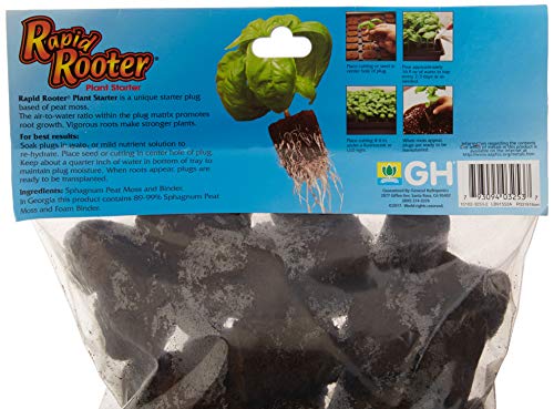 The success of the germination rate will increase if you apply some heat. You will need to keep the rapid rooter moist by filling the grow tray with about a inch of water in the tray below. Rapid rooter plugs are fortified with General Hydroponic micronutrients for abundant root growth.